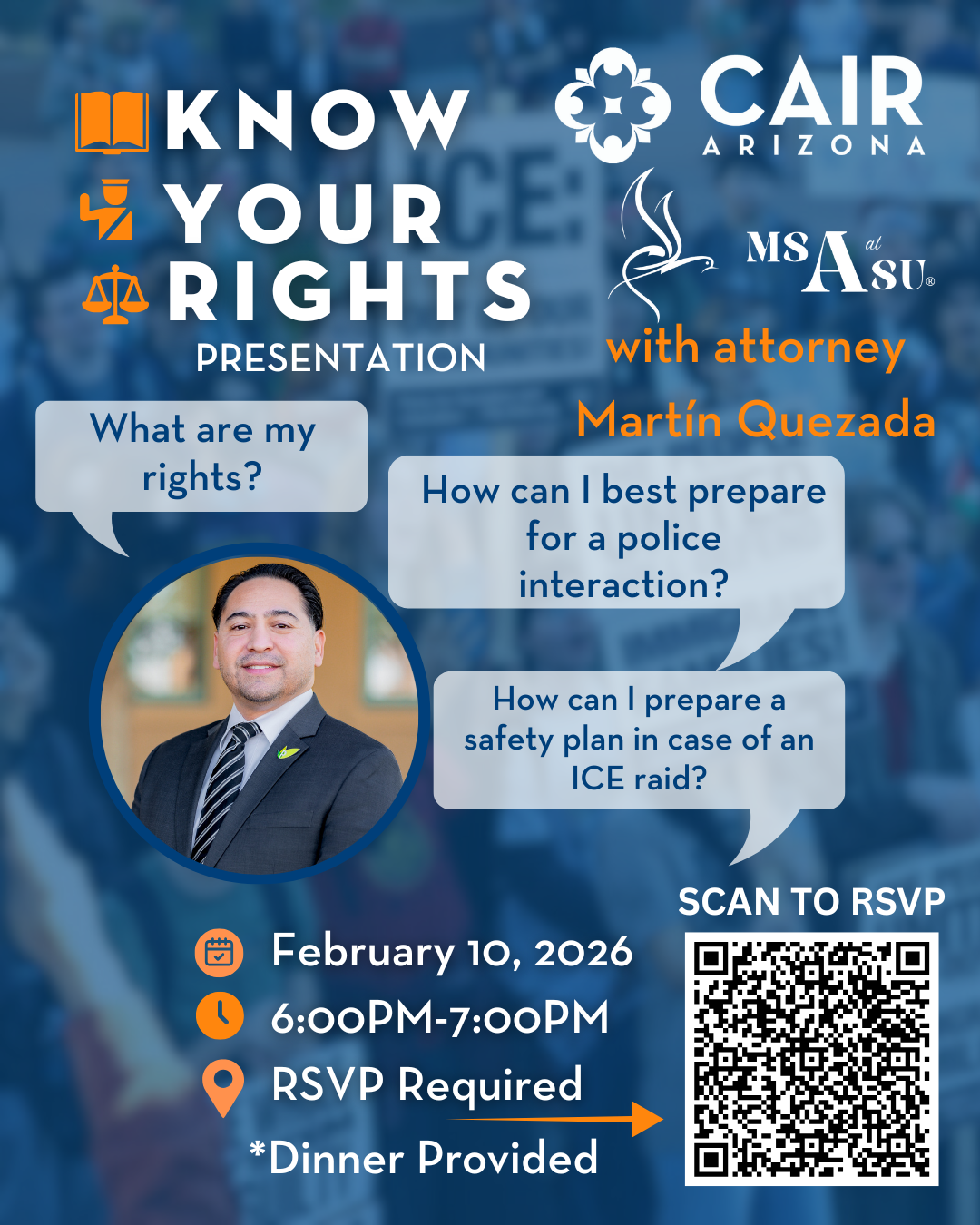 CAIR-AZ is hosting a VIRTUAL Know Your Rights session on Saturday, July 19th at 1PM! We will cover critical topics such as what to do